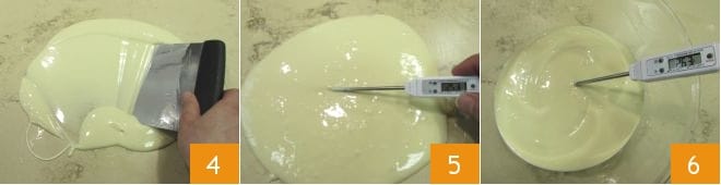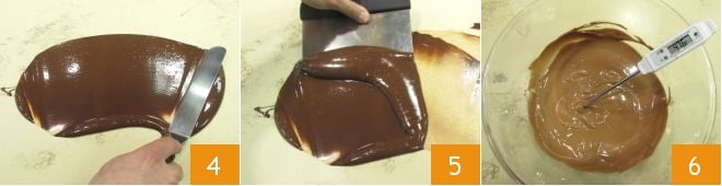 and start spreading the chocolate on the marble slab, with a spatula 4 and a scraper 5, spreading it over the surface 2. When it reaches 82°F (always measure with a kitchen thermometer) 3, transfer it to the bowl where you left the remaining 1/3 of the chocolate and mix 6: the chocolate should reach 88-90°F. If the temperature drops too much at this stage, always keep the double boiler with hot water on hand to slightly warm the chocolate. Conversely, if it's still too hot, repeat the spreading process on marble with a small part of the chocolate.