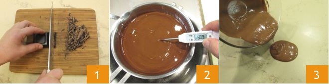 To temper milk chocolate, chop it 1, then melt the milk chocolate in a double boiler (it is preferable that the water in the saucepan does not touch the bottom of the bowl containing the chocolate; it is important that water does not get into the chocolate during the double boiler cooking); when the chocolate reaches a temperature of 113-122°F (measure with a kitchen thermometer) 2, pour 2/3 of it onto the marble slab placed on a worktop 3
