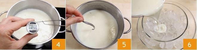 Once the mixture has reached the indicated temperature 4, turn off the heat, remove the vanilla bean 5, and cool the mixture by pouring it into a cold bowl immersed in another bowl full of ice 6 (or in the same pot immersed in a bowl filled with ice).