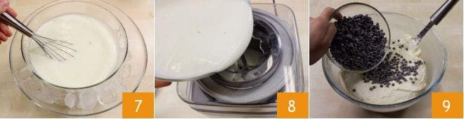 Stir the mixture 7: this operation will immediately cool the cream, maintaining the consistency intact. Place the mixture in the refrigerator, covered with plastic wrap, and let it cool for at least 2 hours (or 1 hour in the freezer). After the necessary time, pour the mixture into an ice cream maker 8 and turn it on for about 30 minutes. When it has reached the right creamy consistency, transfer it to a bowl and add the chocolate chips 9.