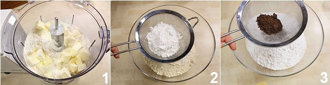 To prepare the ice cream sandwich, start by preparing the dough for the cookies: crumble the cold butter with the flour in a mixer 1, transfer the resulting powder into a large bowl and sift in the powdered sugar and cocoa (2-3). Mix the dry ingredients well together.