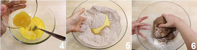 Beat the egg with the yolk and add the honey 4, mix, and incorporate the mixture into the dry ingredients 5. Knead with your hands until you get a solid and compact dough, similar to shortcrust pastry 6.