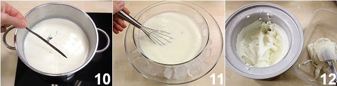 Prepare the cream ice cream: pour the milk into a saucepan, add the sugar, cream, and opened vanilla bean 10, then mix and heat the mixture to no more than 185°F. Once the temperature is reached, immediately place the saucepan in a container with ice water to quickly lower the temperature of the mixture 11 and once cold, pour it into an ice cream maker and churn for at least 30 minutes until the mixture is thick and creamy 12. To see the cream ice cream recipe Vanilla Ice Cream. Before using it, let it firm up further in the freezer for at least 2 hours.