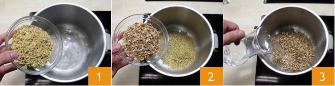 To make the summer spelt and barley salad, start by boiling the grains: place the pearled barley 1 and spelt 2 in a large pot, add plenty of salted water to cover the grains 3 and boil them according to the package directions (they usually need about 15-18 minutes of cooking);