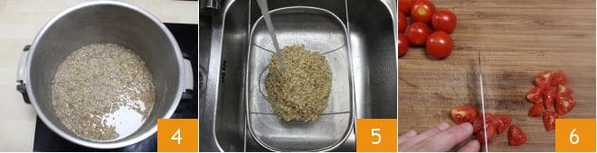 Once cooked, they will have absorbed some of the water 4, drain them and rinse under cold running water to stop the cooking and cool them 5; transfer them to a large bowl and set aside. Now, deal with the tomatoes: wash them under running water and cut them into small wedges 6,