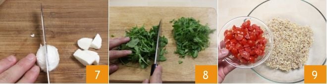 drain the preservation water from the mozzarella balls and dice them 7. Prepare the arugula by washing it well under water; coarsely chop the arugula leaves 8. At this point, take the bowl with the grains and add the cherry tomatoes 9,