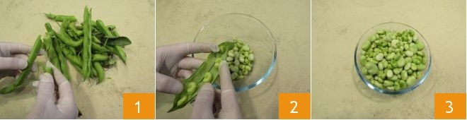 To prepare the fava bean salad, start by cleaning the pods 1. Don't throw them away because you might prepare a tasty Sautéed Broad Bean Peels. If you want, you can wear gloves to shell the beans. Once the pods are opened, shell them 2 and collect the beans in a container 3.