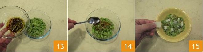Finally, pour the sauce into the container with the fava bean seeds 13, mix 14, and place on the serving dish where you will add cheese shavings to further flavor the fava bean salad 15.