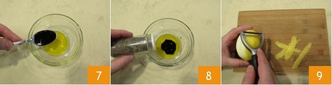 In the meantime, prepare the sauce for flavoring by pouring extra virgin olive oil into a small bowl along with balsamic vinegar 7. Add salt and pepper 8, then using a potato peeler or a knife, making sure not to scrape off the white part of the lemon, which is very bitter, peel the lemon zest 9.