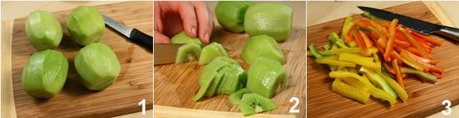 Peel the kiwis 1, cut them in half, and then slice them into 1/8 inch thick slices 2. Wash the bell peppers, then remove the seeds and inner filaments, and cut them into julienne strips 3.