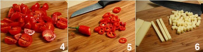 Wash the cherry tomatoes and then cut each into 4 wedges 4, slice the chili (after removing the seeds) 5, and also cut the cheddar into cubes 6: