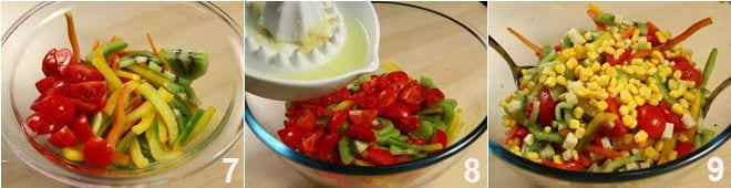 put all the ingredients in a salad bowl 7, pour in the lemon juice 8, salt, olive oil, and corn. Mix everything gently 9 and serve as a side to grilled meat or fish.