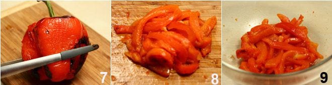 Roast the two peppers in the oven until tender 7; don't worry if the outer skin slightly burns. Peel the roasted peppers and cut them into strips about half an inch wide and 2 inches long 8. Place the strips in a bowl, lightly salt them, and let them rest for 30 minutes 9. This process will help remove excess water from the peppers, which should be saved for the dressing.