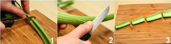 Separate the celery stalks from the leaves 1, remove the fibrous elements 2, and cut them into pieces about 2 inches long 3.