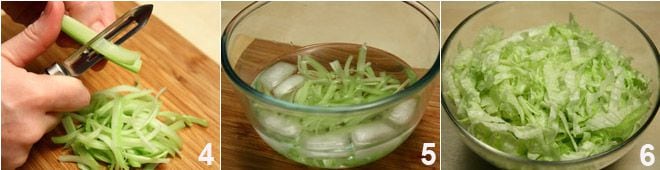 Using a peeler, cut the stalks into strips following the long side 4. Finally, immerse them in ice water to make them crispy 5. Cut similar strips from the washed and dried Iceberg lettuce and place them in a bowl 6; wash the celery leaves thoroughly and chop them finely as if they were parsley.
