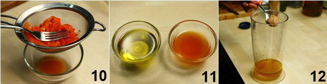 Start preparing the dressing by collecting the peppers' vegetable water with a strainer 10. Put it in a blender and add the same amount of oil and white wine vinegar 11. Also, add the two teaspoons of mustard and the teaspoon of honey and blend well 12, adding a little warm water if the consistency becomes too creamy. Finally, adjust with salt and pepper.
