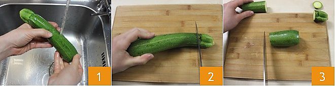 To prepare the zucchini salad with mint and basil, start by washing the zucchini thoroughly under running water 1. Dry them with a cloth and place them on a cutting board, then trim off the two ends 2. Next, cut the zucchini in half 3.