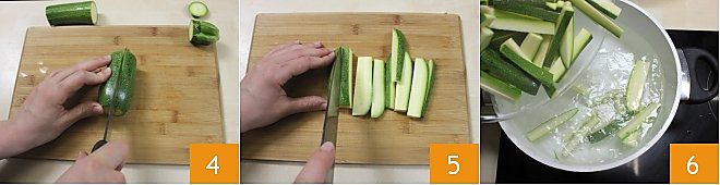 Cut it in half again lengthwise 4 and begin to slice it into pieces about 3/4 inch wide 5. Now take a large pot, fill it with water, and bring to a boil. Then add the sliced zucchini to the boiling water 6.