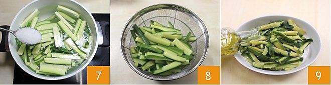 Add a tablespoon of coarse salt 7 and let cook for 10 minutes. After 10 minutes, drain the zucchini with a colander and let them cool 8. Then transfer them to a baking dish and drizzle with a little extra virgin olive oil 9.