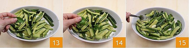 Then add the chopped mint leaves 13 and basil leaves 14. Mix everything with a fork 15 or a spoon, and your zucchini salad with mint and basil is ready to be served and enjoyed either warm or cold. If not serving immediately, keep it in the fridge until it's time to enjoy!
