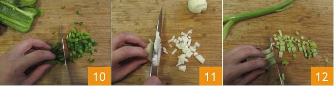 Now you can start preparing the jambalaya: peel and dice the green peppers 10, the onion 11, and the celery 12.