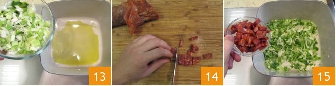 Heat the oil in a saucepan, add the vegetables 13, and sauté over medium heat for about 10 minutes. Meanwhile, dice the chorizo as well 14. After 10 minutes, add the chorizo to the sauté 15,