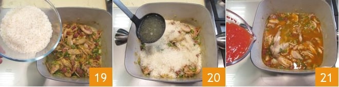 cover with a lid 22, and cook for about 18 minutes or for the time indicated on the rice package, occasionally checking that the liquid has not dried out too much. After 10 minutes, add the whole shrimp 23, close the lid again 24, and continue cooking. Once the rice cooking time is up, the jambalaya should still be slightly brothy at the bottom.