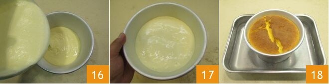 Finally, butter and flour a 6-inch diameter pan (measured at the bottom), 8-inch diameter (at the top), and 5-inch height and pour the mixture (16-17). Place the dish in the bain-marie pan. Bake everything on the lowest shelf of the oven and cook for 20 minutes at 356°F, then lower the temperature to 320°F and continue for another 70 minutes. Once the cake is cooked, turn off the oven, remove the bain-marie pan and let the cheesecake cool completely in the slightly open oven, then remove the cake from the oven 18.