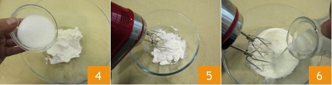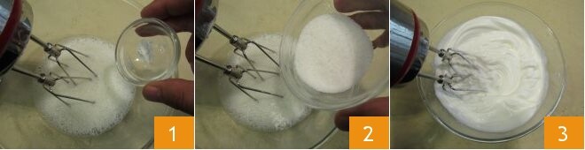 To prepare the Japanese cheesecake, make sure all ingredients are at room temperature. Then, immediately put some water in a large baking pan and place it in the oven: heat it in static mode at 356°F, so that the water will be sufficiently hot for the bain-marie cooking of the cake. In the meantime, take the eggs (at room temperature) and separate the yolks from the whites: beat the whites with cream of tartar 1 and gradually add 80 grams of sugar while the beaters are running 2. As soon as the mixture is very frothy 3, turn off the beaters and clean them thoroughly.