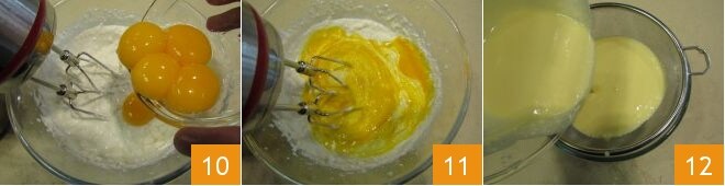 finally, add the yolks, still at room temperature. Be sure to add them gradually 10: continue working the mixture to absorb them 11. At this point, if you notice lumps of cheese in the mixture, you can strain the mixture through a large-mesh sieve 12, otherwise you can skip this step.