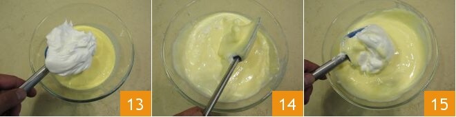 Take the previously beaten egg whites and add them to the bowl a little at a time 13. Gradually fold them in with a gentle movement from bottom to top with a spatula 14, making sure not to deflate the egg whites. Only when the first spoonful of egg whites is absorbed can you add the next one 15.