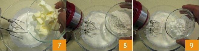 Once absorbed, add the softened butter cut into small pieces gradually 7. Once the butter is completely absorbed, and with the beaters still running, gradually add the flour 8 and cornstarch 9;
