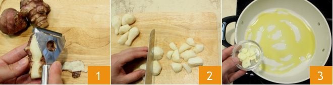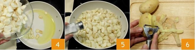 Slightly brown the garlic in the pan 4, then add the Jerusalem artichoke cubes, stir, and season with salt 5 and pepper to taste. Let the Jerusalem artichokes cook for about 10 minutes. Meanwhile, peel the potatoes with a vegetable peeler 6,