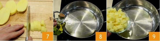 and cut them into small cubes 7 to speed up the cooking; in a large pot, pour the oil 8 and add the potatoes 9.
