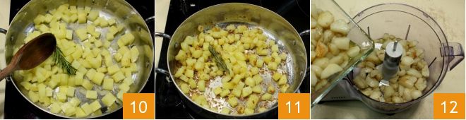 Add a sprig of rosemary 10, salt, and pepper to taste, and let them cook for 10 minutes. Stir occasionally to brown the potato cubes well. When they are nicely browned, turn off the heat 11. In a blender, place the cooked Jerusalem artichokes 12.