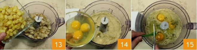 Add the potatoes as well 13, then blend everything. Next, add the eggs 14 and the chopped chives 15.