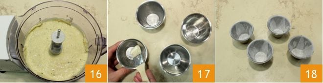 Run the blender until you get a smooth and creamy mixture 16. Then prepare the 1/2 cup aluminum molds, brush them with some oil 17, and line them with parchment paper: cut out a circle for the bottom and strips for the sides to fully cover the molds 18.