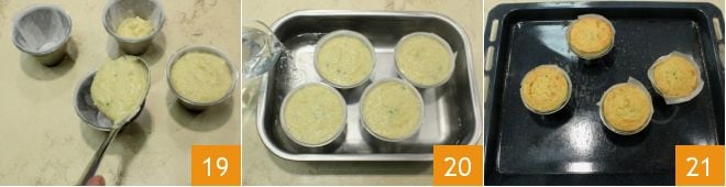 Then, with a ladle, pour the Jerusalem artichoke and potato mixture into each mold 19, leaving half an inch from the edge. Place the molds in a high-edged baking tray and pour in water until it reaches the base of the flans 20. Bake in a preheated static oven at 350°F for 40-45 minutes. Then remove the flans, place them on a baking sheet, and grill them for 5 minutes. Then take them out of the oven 21.