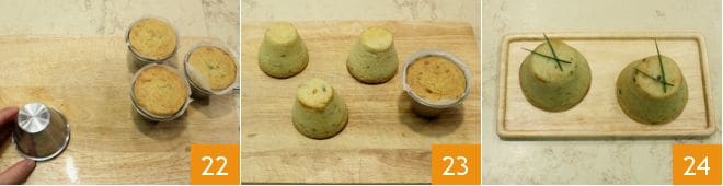 Remove the Jerusalem artichoke flans, let them cool slightly, then unmold them by turning them out onto a cutting board (22-23). You can serve them decorated with a sprig of chives 24 and enjoy them warm or even cold as an appetizer or a tasty side dish!
