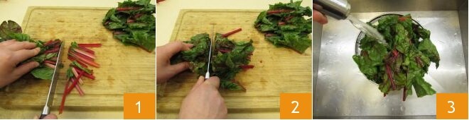 To prepare John Dory with peaches and chard, start by cleaning the latter. Remove the ends of the stalks 1, split the leaves in half 2, and rinse them under running water 3.