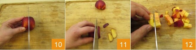 Wash the nectarine, cut it in half using a knife 10, remove the pit, and first slice it into 0.4-inch thick slices 11 and then into cubes 12.