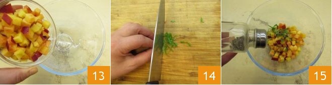 Transfer the cubes to a large bowl 13, and add the lemon balm leaves, after chopping them with a knife 14. Season with salt, pepper, and a drizzle of oil.