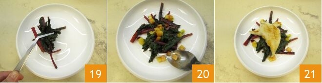 If necessary, in the meantime, slightly reheat the red chard before plating. Divide the red chard among the serving plates 19, add the nectarine cubes 20, and finally the fish fillets 21. John Dory with peaches and chard is ready to serve!