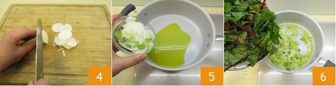 Slice the spring onion 4 and transfer it to a pan where you have already added a drizzle of oil 5. Let it soften for about ten minutes, stirring occasionally, then add the red chard stalks.