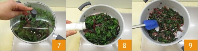 Cover with a lid 7. Cook for about ten minutes, and when they have wilted, season with salt 8 and pepper. Continue cooking for a couple more minutes 9, then set them aside.