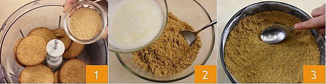 To prepare the key lime cheesecake, start by setting up the base: place the Digestive biscuits in the mixer together with the brown sugar 1, then finely chop them and transfer them to a bowl; in the meantime, melt the butter over low heat in a small saucepan. When it is melted, let it cool slightly, add it gently in a thin stream to the crushed biscuits 2, and mix everything well. Butter a cake pan, preferably with a removable bottom, with a diameter of 9 inches; cut out a circle of parchment paper the same diameter as the bottom of the pan and two strips the same height as the sides, then line the pan itself. For this operation, you can consult the guide Cooking school: how to line a cake pan with parchment paper. Then pour the crumbled biscuits into the cake pan and use the back of a spoon to compact the biscuit base evenly over the entire surface 3. Allow the mixture to cool in the refrigerator for at least 30 minutes or in the freezer for about 10 minutes.