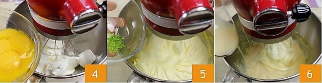 Now focus on the filling: put the fresh cream cheese and the 4 egg yolks in a stand mixer fitted with beaters 4. Alternatively, you can use a large bowl and an electric mixer or a hand whisk. Beat the ingredients until you get a light and fluffy mixture. Then, continue mixing with the beaters while adding the other ingredients: add the grated lime zest 5 and the condensed milk in a thin stream 6.