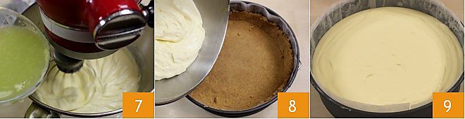 Finally, gradually add the lime juice to the mixture and mix the ingredients until you obtain a homogeneous batter 7. Now your cream is ready. Remove the compacted biscuit base from the refrigerator and pour the cream into the cake pan 8. Be sure to cover the base evenly, using a spatula to level the surface. Then place the cake in the oven and bake for 60 minutes in a static oven preheated to 340°F. For a convection oven, bake the cheesecake for 35-40 minutes at 300°F 9.