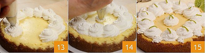 Once the cream is whipped, transfer it to a piping bag with a star tip. Once the cheesecake is done, remove it from the oven, let it cool slightly, and unmold it onto a serving plate, then place it in the refrigerator to chill for 3-4 hours. When it is cold, decorate it with tufts of cream to your liking (13-14). To give your key lime cheesecake an even more scenic touch, you can gently place thin strips of lime zest on each cream tuft 15!