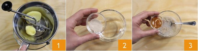 To prepare the savory doughnuts with potatoes and Emmentaler, first boil the potatoes, drain them, and pass them through a food mill (or potato ricer) 1. Dissolve the yeast 2 and malt 3 in water.